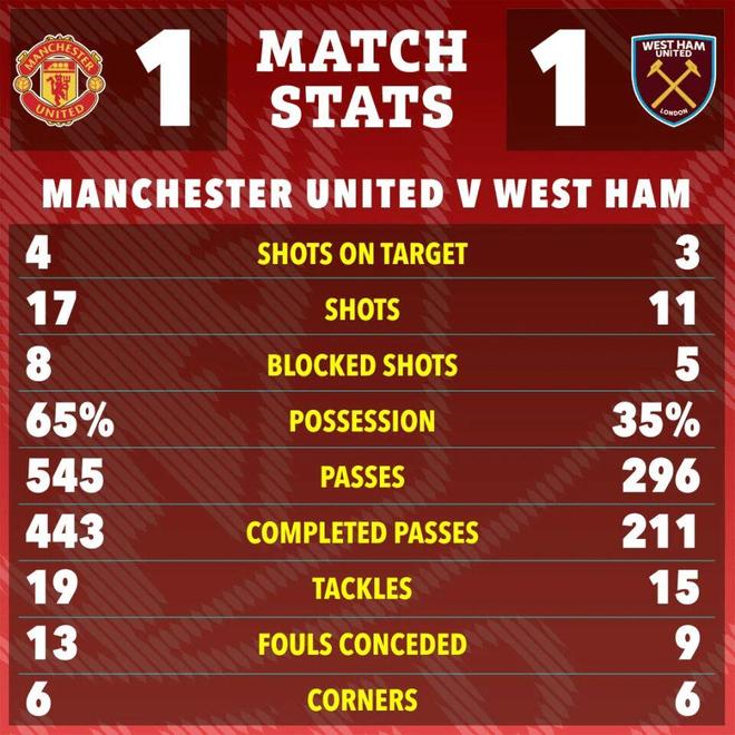 曼联在第58分钟首先打破僵局,卡塞米罗禁区前远射折射后,恰好落在门前的迪奥古·达洛脚下,后者冷静一停一射破门,这是达洛两年来在英超的第一粒进球,帮助曼联1-0西汉姆。